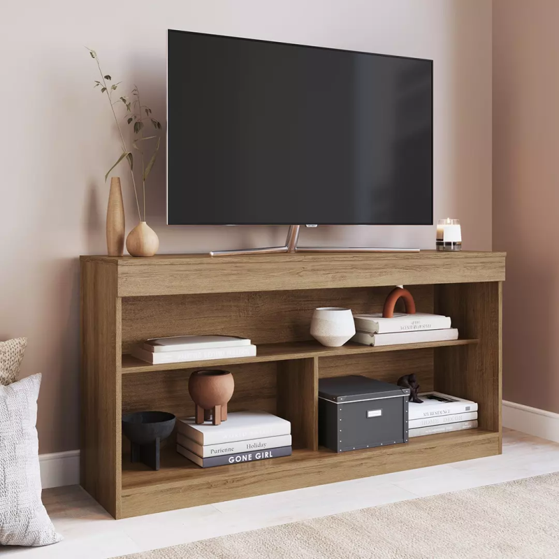 Gracias a su estructura compacta pero espaciosa, permite organizar televisores, dispositivos electrónicos, libros o elementos decorativos, adaptándose fácilmente a diferentes ambientes del hogar.