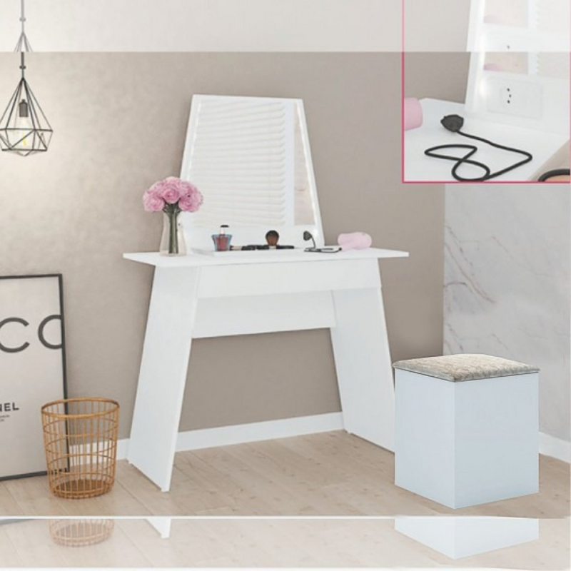 El Tocador TOHALET FIREZZO PE-2011 con Puff Chest PU-2052 de Home Tienda combina funcionalidad, estilo y comodidad. Fabricado en MDP de 15 mm con acabado en BP blanco mate, incluye un gran espejo con iluminación LED integrada y salida bivolt para mayor practicidad. Su cajón con correderas metálicas soporta hasta 3 kg, perfecto para organizar maquillaje, perfumes y bisutería, mientras que los soportes superiores resisten hasta 25 kg.